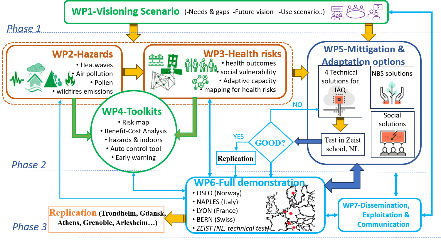 To verify the effectiveness of healthRiskADAPT’s risk assessment services and adaptation options, the full demonstrations of transformative solutions on 4 use cases (TRL at 7-8) will be implemented with User's direct involvement in climate adaptation at the individual and collective level (addressed in WP1 and WP7). The demonstrations are synchronized with the outcomes from i) WP2-Hazards and WP3-Health to assess health risks and vulnerabilities ii) WP4-Interactive dashboard with risk map & cost-benefit analysis to assess the health risk assessments and select adaptation options where adaptation options are customized and tested in WP5.